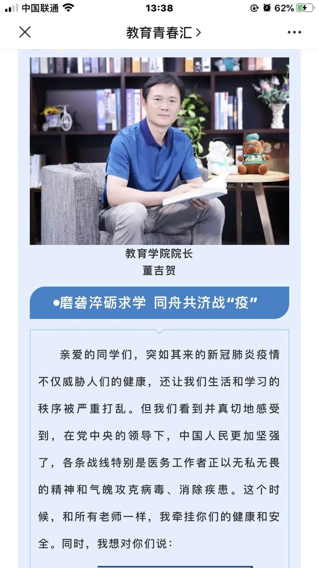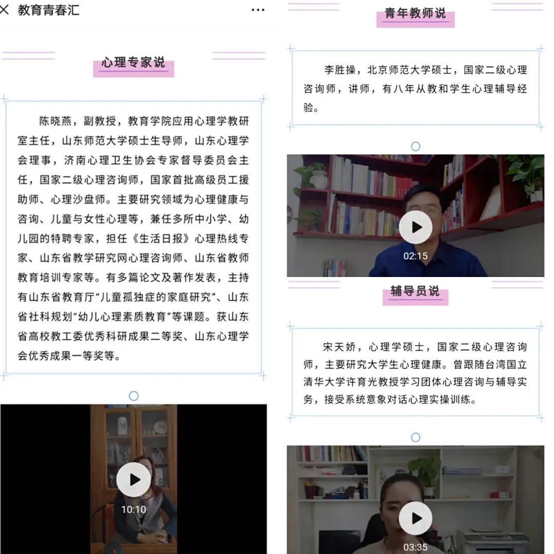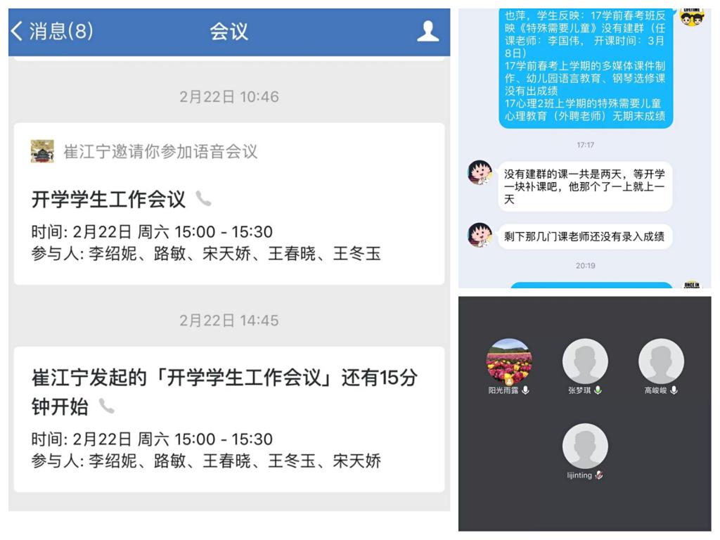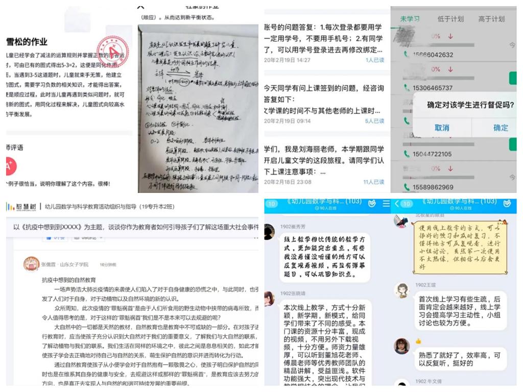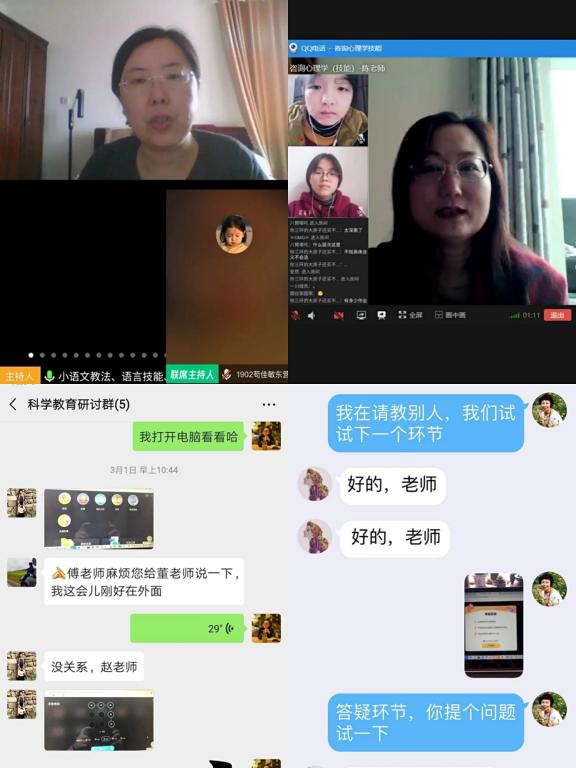 为了使同学们能够尽快适应这种新颖的教学方式,教育学院领导提前策划,高度重视,发布了《2020年春季学期教育学院教学工作实施意见》,授课教师课前准备充分,课件制作认真,线上课程扎实推进。教育学院党总支书记李君、院长董吉贺用“开学第一课”的形式,勉励大家珍惜时光,不负韶华。心理专业的老师们为同学们录制了视频,为疫情下大学生心理问题支招解困。学院辅导员也在正式开课之前,通过QQ、腾讯会议APP等软件与同学们开展了一堂别开生面的班级会议。