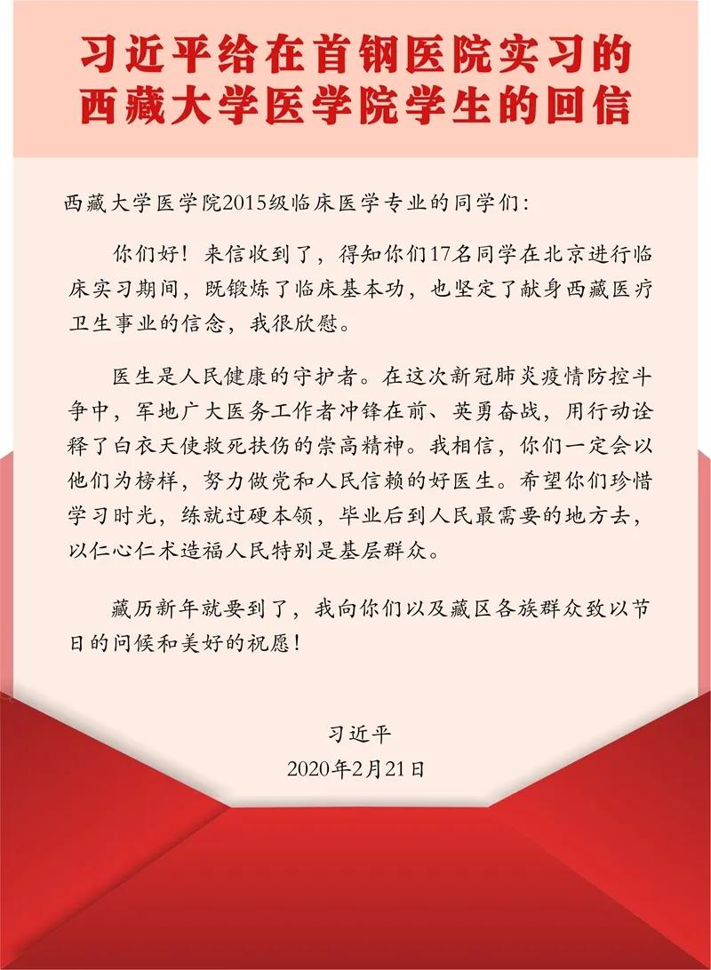 “希望你们珍惜学习时光,练就过硬本领,毕业后到人民最需要的地方去,以仁心仁术造福人民特别是基层群众。”藏历新年来临之际,中共中央总书记、国家主席、中央军委主席习近平2月21日给正在北京大学首钢医院实习的西藏大学医学院学生回信,引发山东女子学院教育学院学生的强烈反响,同学们纷纷热议。