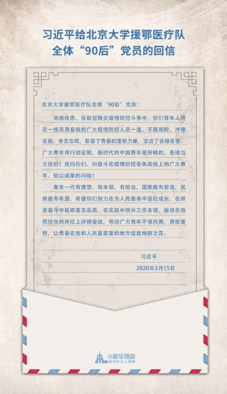 在学习了《习近平总书记给北京大学援鄂医疗队全体“90后”党员的回信》后,我看到了“90”后党员在防疫第一线的英姿飒爽,并深知这份安全是你们用血肉之躯铸就的,这份希望是你们用无畏信念种下的,幸得有你,山河无恙。