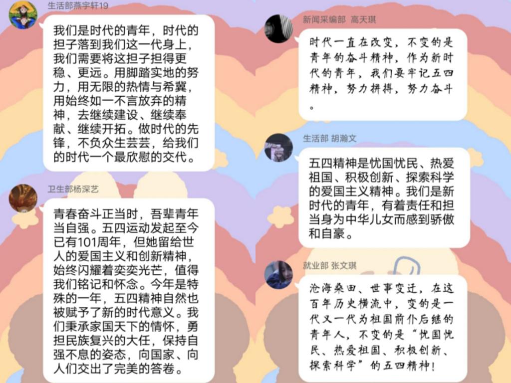 上世纪之初,1919年五月,中国热血青年作为一支新生的社会力量登上了历史舞台,掀起了伟大的五四爱国主义运动。2020年的五月,正处于新冠疫情的防控战争中,不仅是一次危机,也是一次大考。作为新时代的新青年,既要有应对危机的本领担当,也要有经受考验的决心信念。秉承五四的爱国精神,在奋斗中磨砺品质,用实际行动阐释青春蓬勃的力量,让青春在党和人民需要的地方化茧成蝶、淬火成钢!