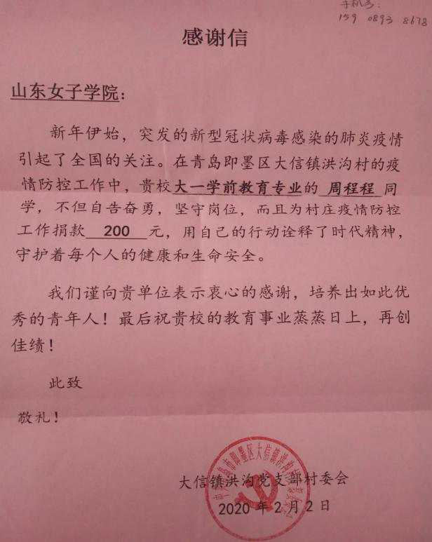 2020年的冬天因为一场新冠肺炎疫情显得格外漫长,全国上下,十四亿双眼睛,十四亿颗心,焦急地盼望着春的到来的同时,更焦急地盼望着抗疫前线传来的喜讯。国难面前,山东女子学院教育学院的学子们挺身而出,他们在疫情中坚守初心,在防控中担当使命,积极投身到抗击新冠疫情的工作中,以实际行动阐释着何为“最美的逆行者”。3月30日这天,学校收到了一封来自青岛即墨区大信镇洪沟村村委的来信,内容如下: