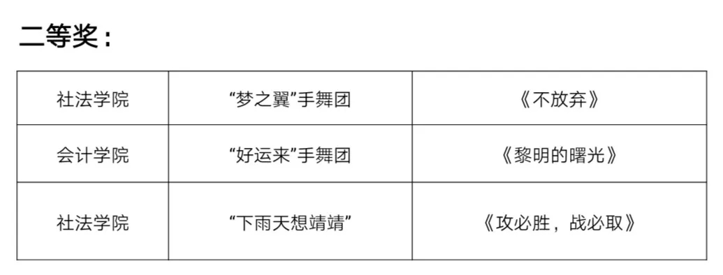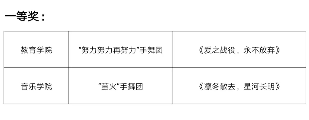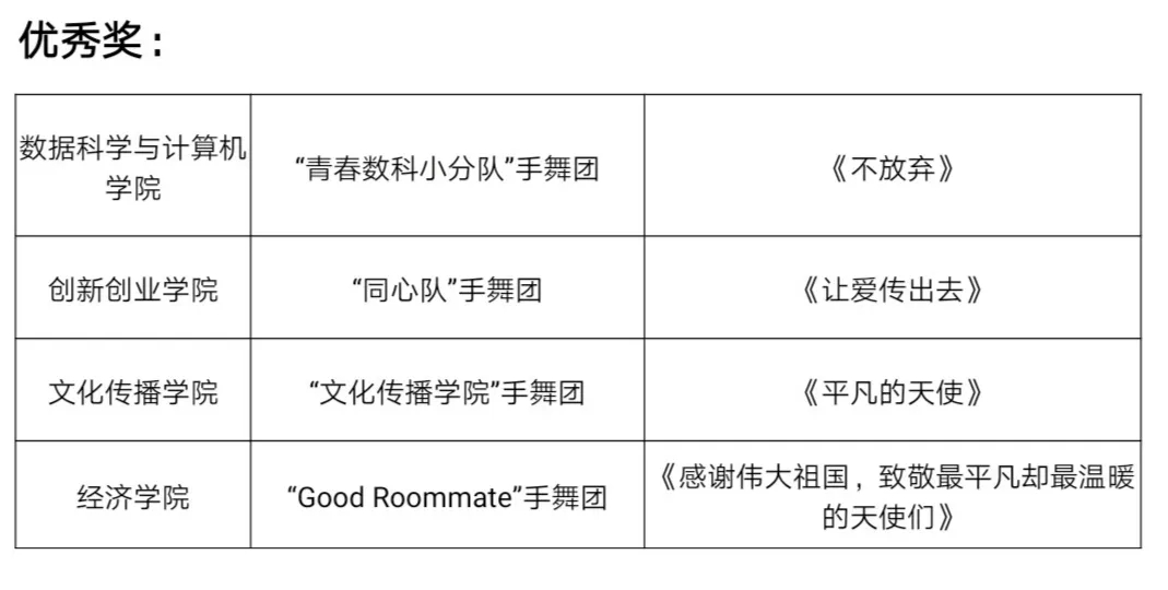 经过专业评委打分和观众线上投票,教育学院和音乐学院获得一等奖,社法学院、会计学院获得二等奖,外国语学院、工商管理学院、艺术设计学院、会计学院获得三等奖,数据科学与计算机学院、创新创业学院、文化传播学院、经济学院获得优秀奖。