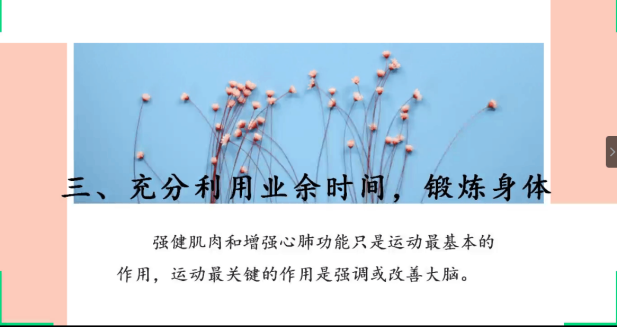 “身体是革命的本钱。”健康的身体是开展一切工作学习的前提,杨雪老师强调以增进健康,调节精神和丰富文化生活为目的的身体活动,提倡同学们根据自己的身体状况和爱好来制定有效的锻炼计划,同时杨雪老师分享了她带领学生课下进行体育锻炼并且效果优良的教育经验,点明了体育锻炼能使自己和活力旺盛的小学生体验到成功感、愉快感和自我价值感。