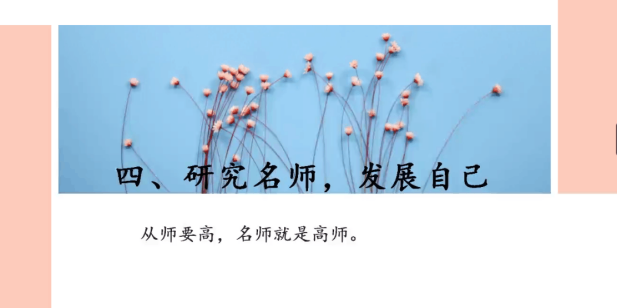 要想有自己的教学风格并且有一定的发展,要先模仿和研究名师的课堂。杨雪老师举出自己学习名师窦桂梅课堂的例子,希望小教的同学们先继承名师的教学方法,在研究和总结自己的实际情况的基础上进行创新与发展。