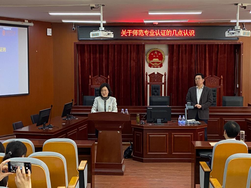 4月29日下午,我校特邀请师范类专业认证进校专家、曲阜师范大学张良才教授来校,作了题为《关于师范类专业认证的认识与体会》的专题报告。副校长刘恩允,教务处负责人,各学院院长、教学副院长、教育学院全体教师聆听了报告。张良才教授分四个方面对师范类专业认证的内涵与背景、理念与原则、认证的实施、应对策略等问题进行深入阐释。他表示,师范类专业认证是基于培养高素质专业化创新型教师的重要举措,认证以学生中心、产出导向、持续改进为基本基本理念,突出以学生为本、强化高校主体责任、助力保障机制建设、坚持以评促建等原则。报告会上,他对认证的8个一级指标和39个二级指标的要义进行了详细说明,并对认证程序、专家进校考查环节、细节、注意事项等问题进行深入交流与探讨。张良才教授的报告风趣幽默,视野宽阔,内容丰富,具有很强的针对性,对切实做好认证的准备工作具有重要指导意义。