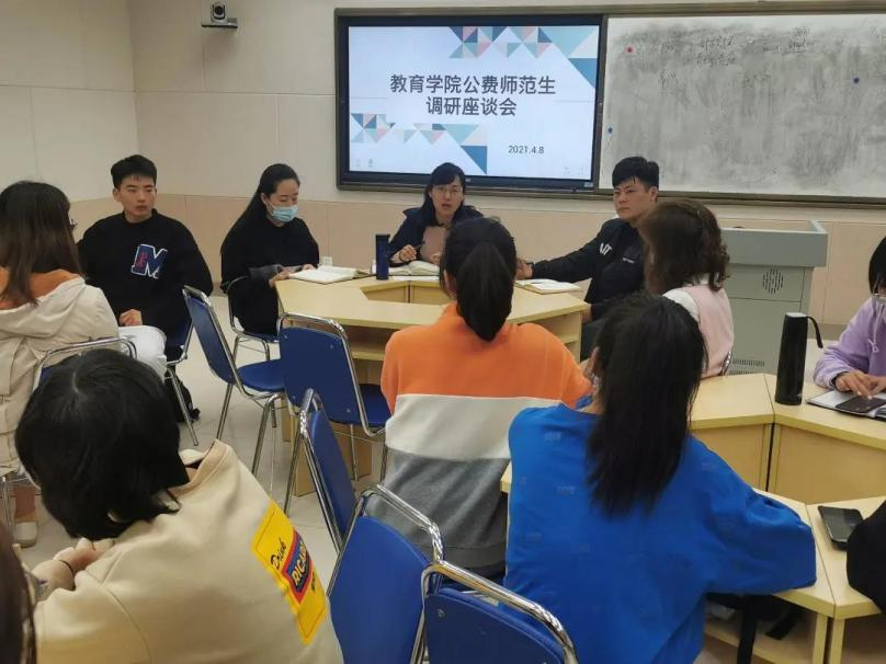 4月8日下午,教育学院在博雅楼B201举行公费师范生调研座谈会,2018级、2019级学前教育及小学教育专业25名公费师范生代表参与座谈,学院党总支副书记路敏、教师代表及辅导员等进行现场交流与答疑。