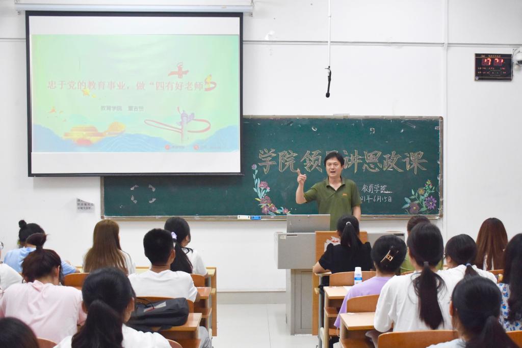 6月15日下午,教育学院院长董吉贺以“忠于党的教育事业,做四有好老师”为主题,在博学楼108教室为教育学院60余名入党积极分子同学讲授思政课。