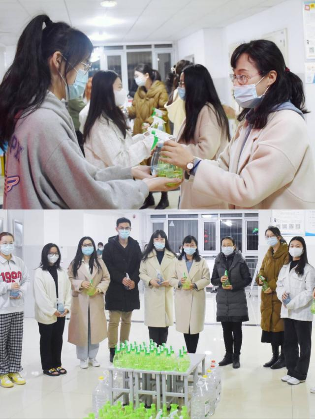 教育学院全体辅导员老师在结束了一天紧张工作后来到学生公寓进行酒精分装和发放,各班同学井然有序地排队领取消杀物资,大家在看到用酒精喷壶摆成的“加油”两字时,心中不禁泛起了阵阵暖意,更加坚定了师生同心抗疫的信心和决心。
