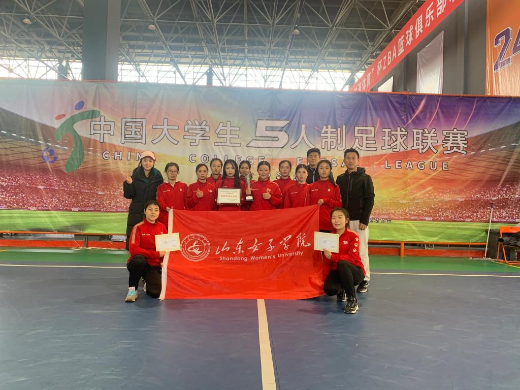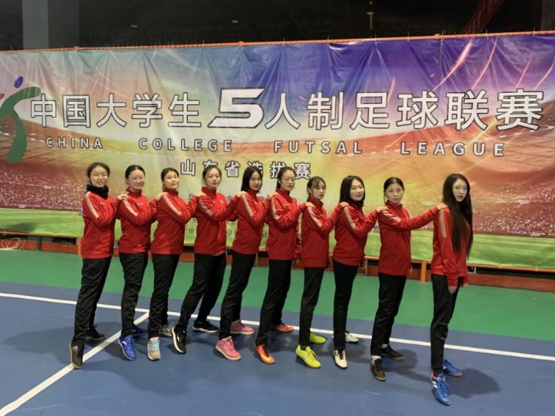 2019年中国大学生五人制足球联赛山东省选拔赛于2019年12月25日-2019年12月29日在山东淄博创濠体育健身综合体育馆举行,共有来自全省的19所大学足球队参加了本次赛事。本次比赛我校足球队由体育教学部李小健为领队,曹斌、闫云娇为教练共同带队,我校女子足球队共选拔11名优秀队员(教育学院李清岚、郝会、王心月;工商学院张宁、荆广梅、史明鑫、韩乔颜;外国语学院韩传苗;艺术设计学院牛琦;旅游学院刘珊珊;数据科学与计算机学院麻文晨)首次出征参加五人制比赛并勇夺校园女子组季军。12月25日,我校女子足球队在比赛中以5:0战胜了山东大学女足代表队首战告捷。在最后与山东大学威海校区代表队争夺季军的比赛中,队员很好地执行了教练员的战术部署,最终以1:0完胜对手获得比赛季军。
