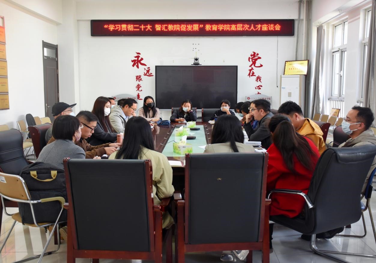 2022年10月20日,在博雅楼A303会议室举行了“学习贯彻二十大,智汇教院促发展”教育学院高层次人才座谈会,学院党委委员、学院2018年以来入职的18位高层次人才教师参加会议,共话学院发展和个人成长。座谈会由学院党委书记崔江宁主持。