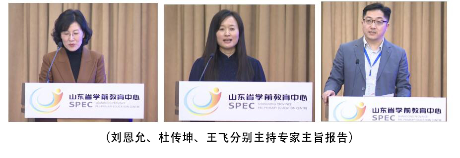 最后一个环节的4位专家主旨报告由山东女子学院教育学院副院长(主持工作)王飞主持。分别是山东省人民政府教育督导室二级调研员王春英、山东省学前教育中心直属幼儿园省第二实验幼儿园执行园长郭玉村,山东师范大学学前教育学院院长、教授、博士生导师杜传坤,山东女子学院教育学院教授董旭花进行主旨报告。其主题分别是《以“双普”督导评估为契机 推进学前教育普及普惠安全优质发展》、《全环境立德树人 高质量协同共育》、《幼小衔接背景下的儿童阅读教育》、《基于幼儿自主性发展视角 思考自主游戏中的教师角色》。概括而言,此4位专家分别强调了学前教育事业高质量发展中离不开“高质量的督导”保驾护航,高质量的学前教育离不开高质量的家园协同共育,高质量的学前教育法离不开在科学幼小衔接下进行科学的儿童阅读,高质量的学前教育发展离不开幼儿的自主游戏与自主发展。