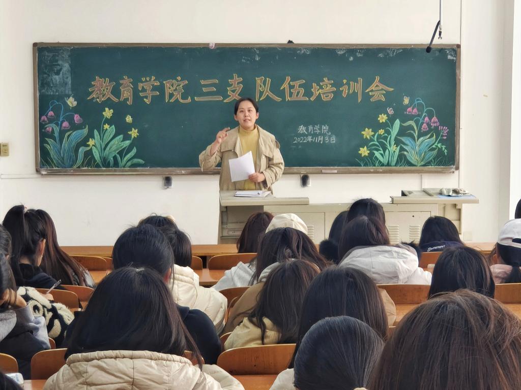 2022年11月3日,教育学院组织学生三支队伍培训会,旨在进一步提高学院学生三支队伍的工作质量,增强学生三支队伍的工作能力,充分发挥学生三支队伍服务学院发展大局、服务决策方面重要作用。本次会议由教育学院辅导员王冬玉老师主讲,教育学院学生三支队伍全体成员及新媒体中心同学参加会议。