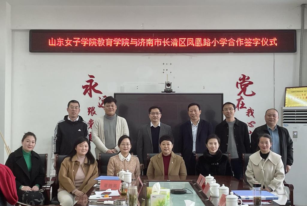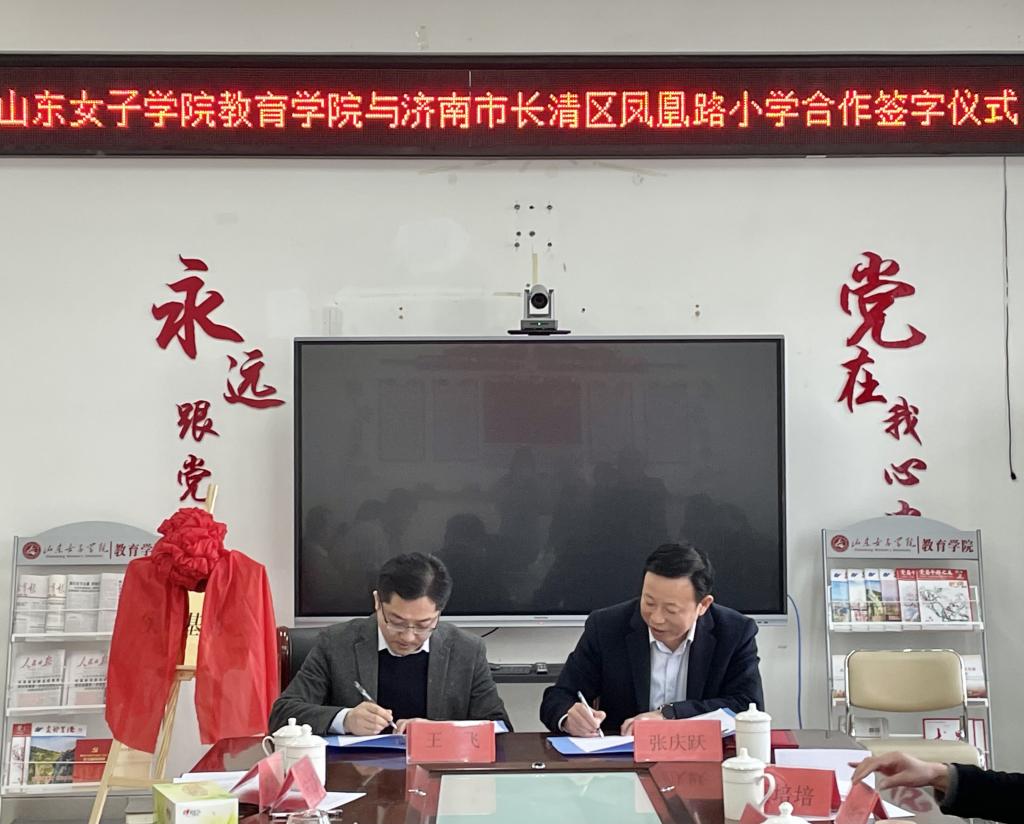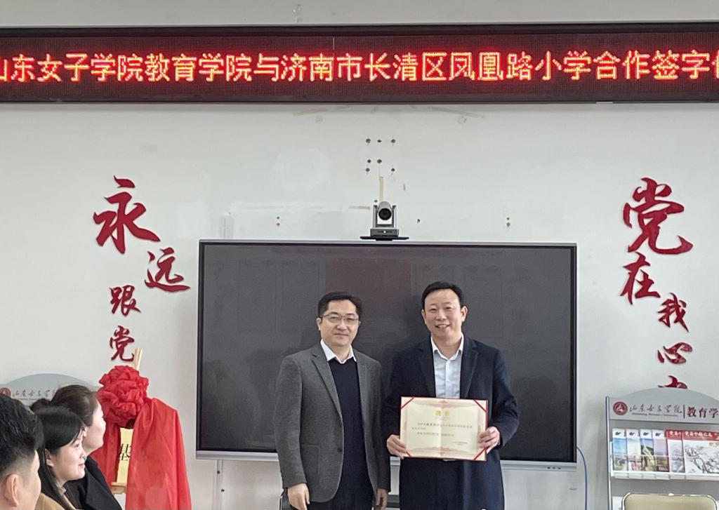 王飞与张庆跃签署了“山东女子学院教育学院实习基地”协议书,为张庆跃颁发了“校外导师”聘书。横向项目负责人陈晓燕教授与凤凰路小学签订了横向项目合作协议书。