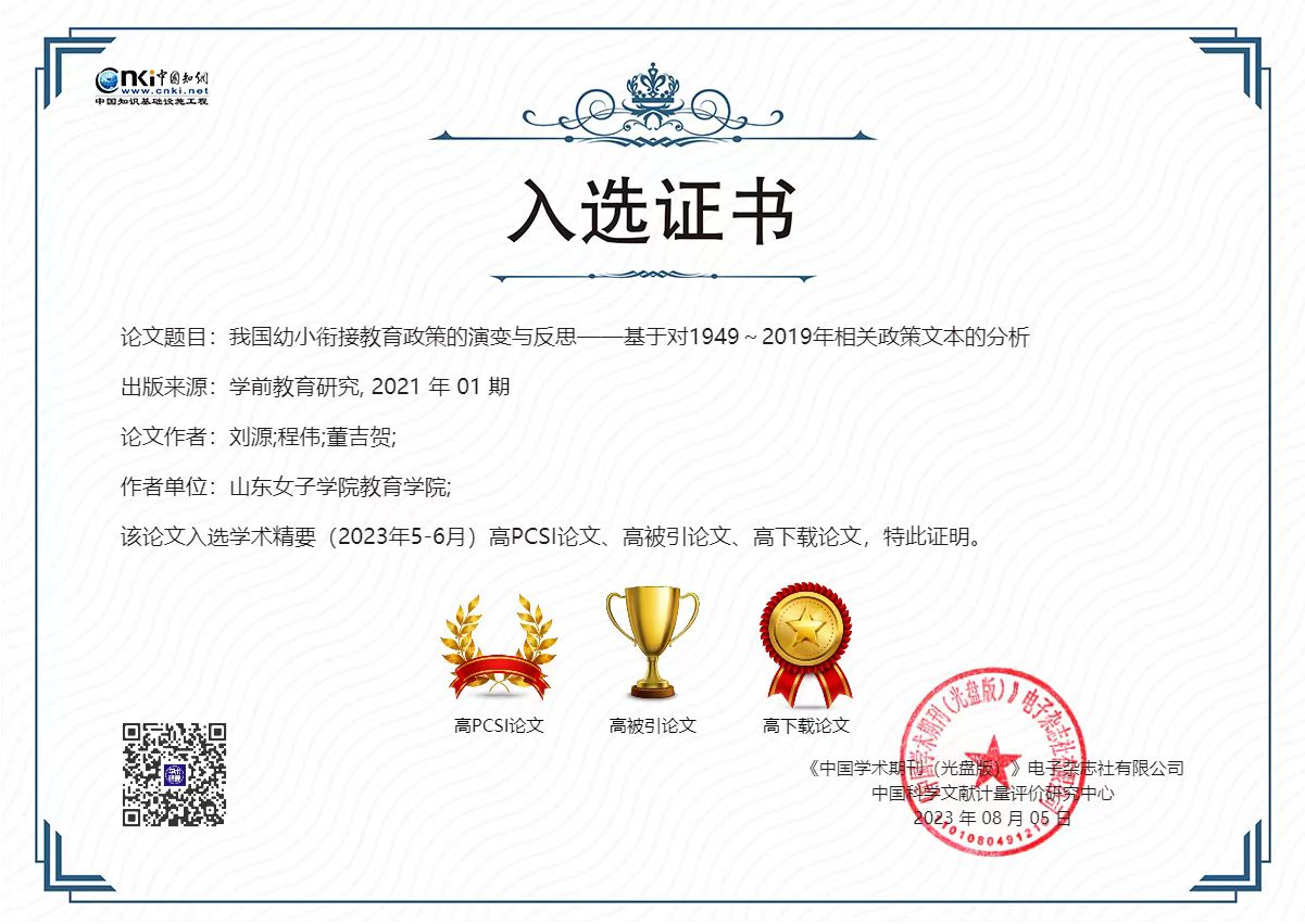 近日,山东女子学院教育学院幼小衔接研究团队刘源、程伟、董吉贺发表在《学前教育研究》2021年第1期的论文《我国幼小衔接教育政策的演变与反思——基于1949-2019年相关政策文本的分析》入选中国知网《学术精要数据库》高PCSI论文、高引用论文和高下载论文。