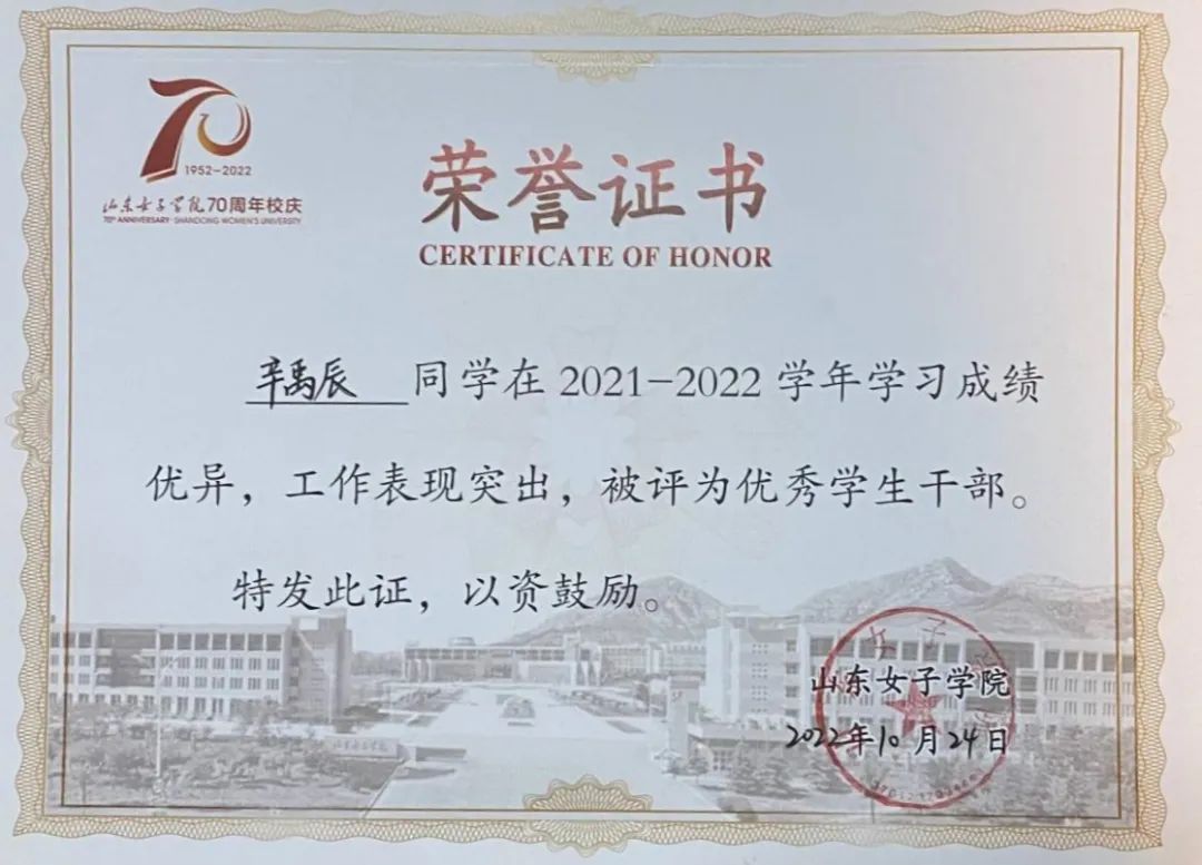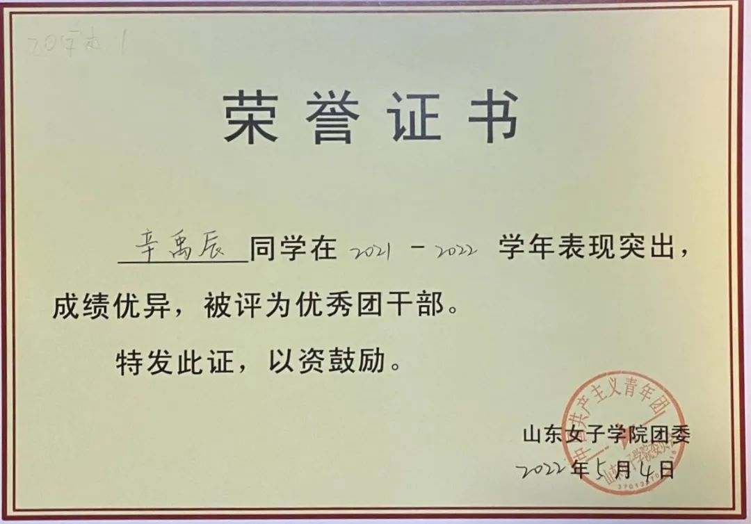 恪尽职守,奋发图强。作为学生干部,辛禹辰始终以身作则,带领班级同学在实践中向前迈进。自从入校担任班级班长后,她组织策划班级主题学习及文体活动50余个,积极为同学们服务,是同学们的“主心骨”;大二担任学院学生会主席团成员,策划党史知识竞赛、儿童剧展演等活动30余个;在疫情形势复杂之时的毕业季,统筹负责全院三百余名毕业生行李的打包、邮寄工作,1000余个包裹无一丢失;担任山东女子学院学生会执行主席期间,积极配合老师工作,深化学生会改革,推动服务型学生会建设,搭建“校-院-班”三级联动体系,打造“团小青”志愿服务队、“好小益”学生会品牌。