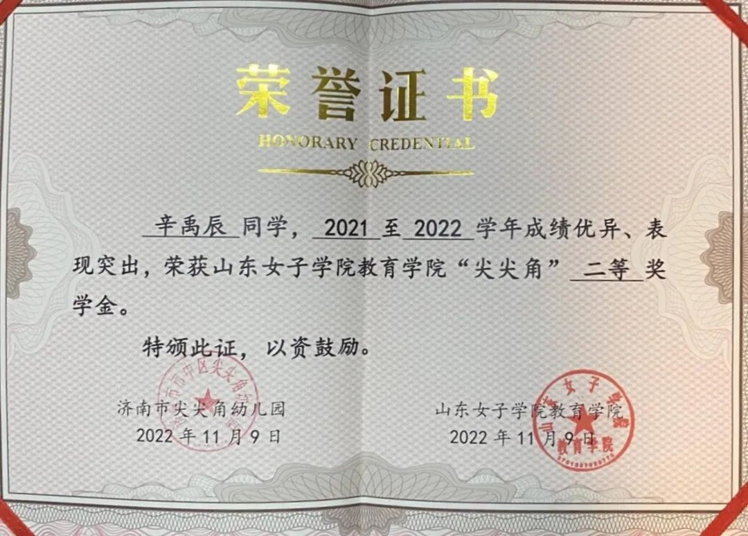 入学以来,辛禹辰获得多次学校二等奖学金、三等奖学金,一次进步奖学金,一次“尖尖角”奖学金。获评校级“优秀学生干部”“优秀团员”“优秀团干部”“优秀志愿者”等荣誉称号;“十四五”学前教育省级课题一项。踊跃参加“挑战杯”课外学术科技作品竞赛并取得省级三等奖,在“互联网+”创新创业大赛中获得校级一等奖并进入省赛;乐于参加主题征文比赛、摄影大赛等活动,多次获得一等奖。在求学之路上,辛禹辰从未停止自己的脚步,一次次优异成绩的背后是她勤恳努力的付出与不断向上的毅力。