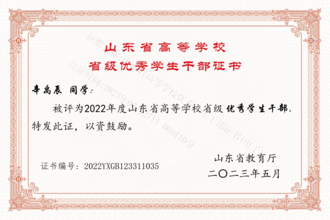 躬身实践,砥砺前行君子之学,未尝离行以为知也。辛禹辰躬身实践,用实际行动践行青春使命,彰显青春风采。连续两年暑期参与三下乡社会实践活动,活动覆盖1000人次,所在团队获得“全国百强实践团队”等多项国家级奖项;在山东省疫情防控形势严峻复杂之时,起而行之,勇挑重担,积极组织、号召、参与学校“团小青”志愿服务队的组建和调度日常核酸抽检志愿服务,服务覆盖全校16000余名师生。在校期间积极参加各类校级志愿活动、院级志愿活动、党支部志愿活动等,累计志愿时长达500小时,获评“优秀志愿者”等称号。