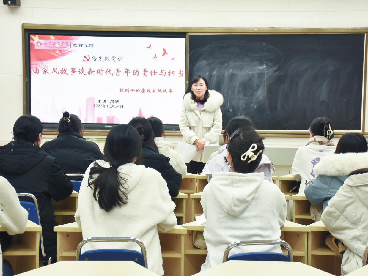 为深入学习贯彻习近平总书记关于党风廉政建设的重要论述,营造风清气正的良好氛围,11月24日,教育学院在博雅楼B201开展以“由家风故事谈新时代青年与祖国的发展”为主题的党课学习活动。本次党课由教育学院党委副书记路敏主讲,部分党员、入党积极分子参加。