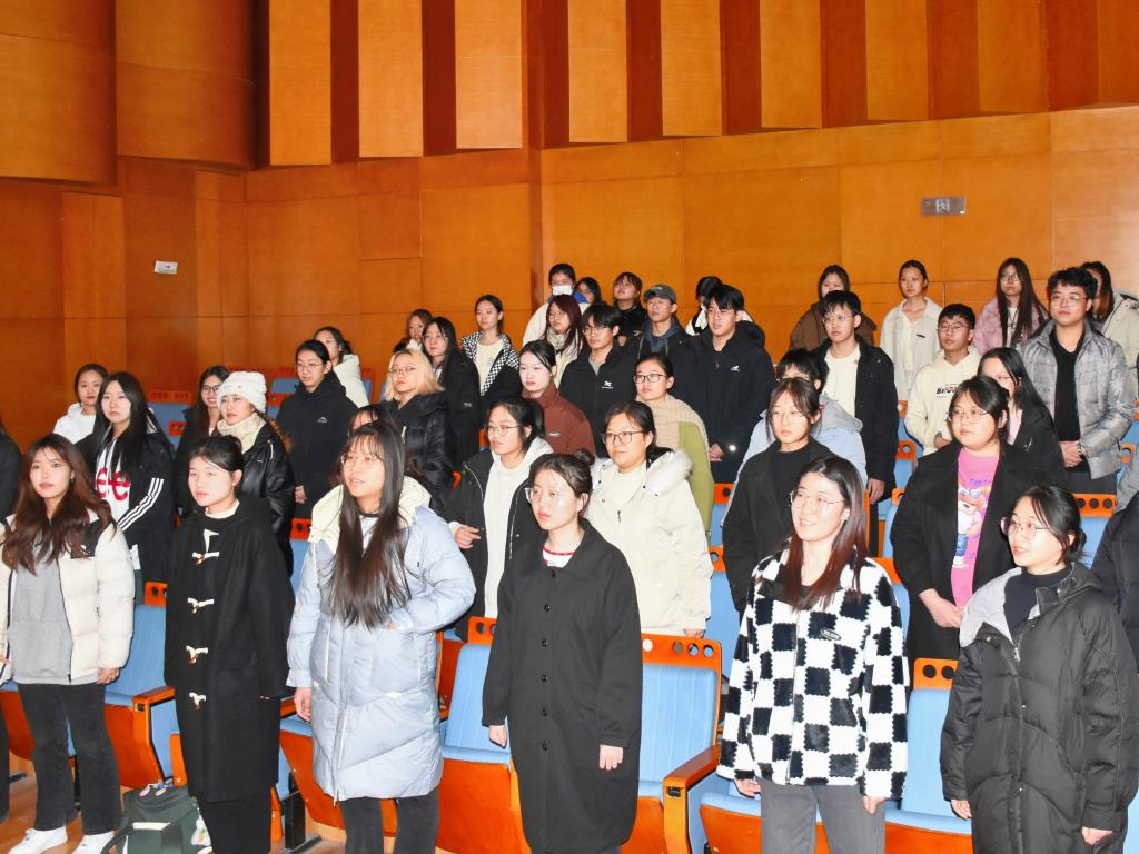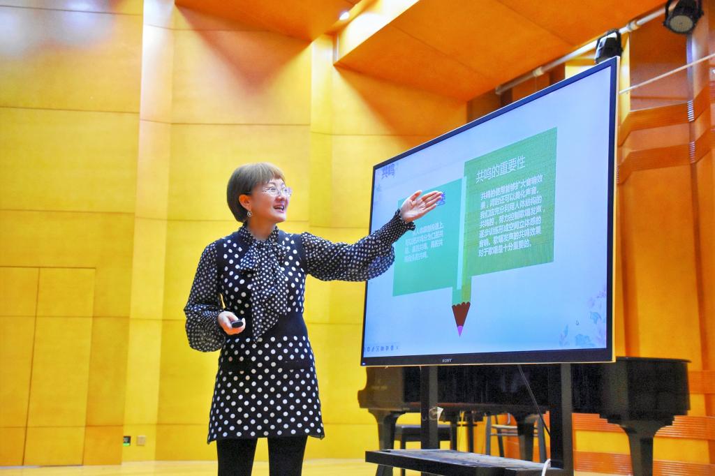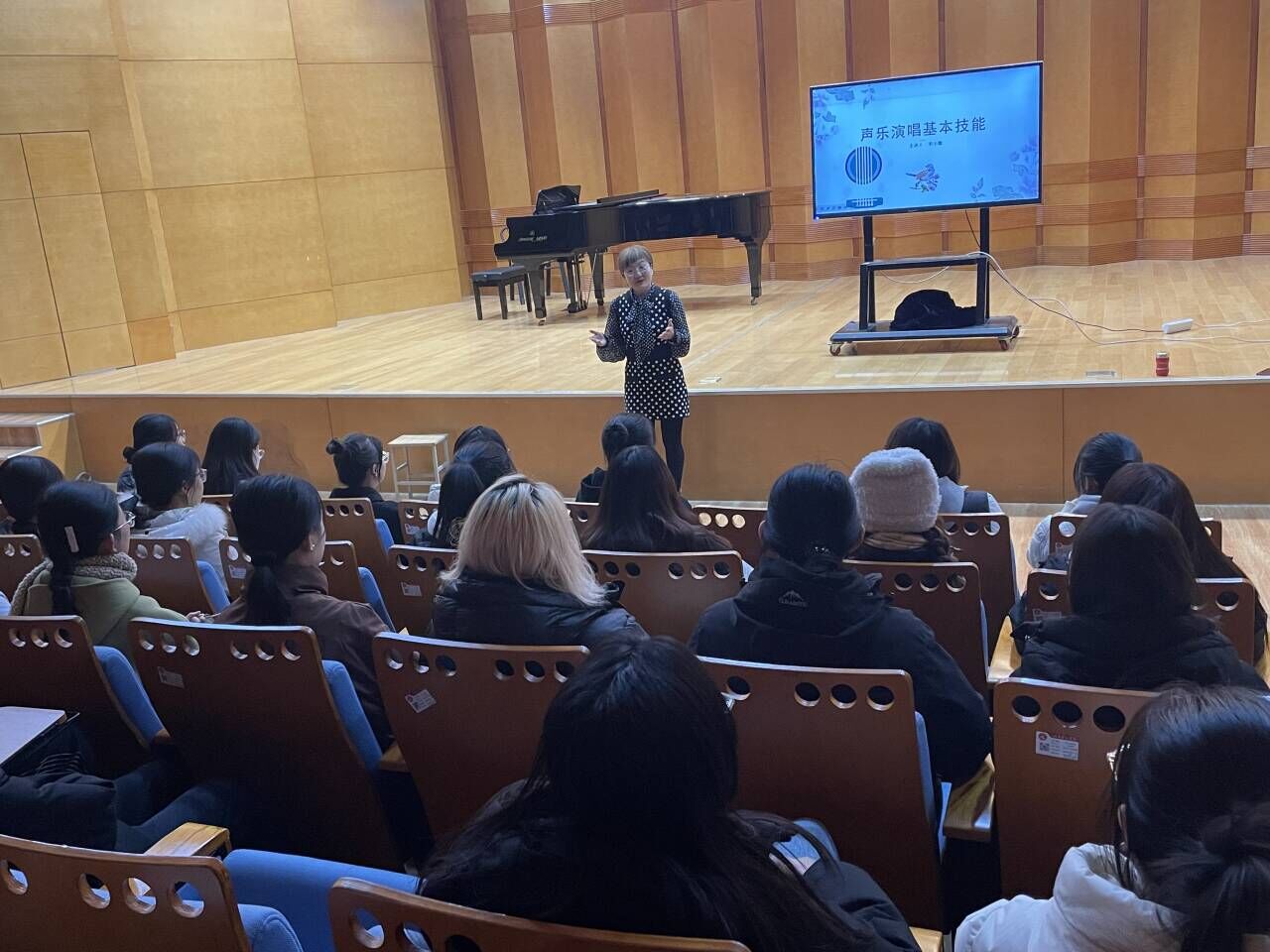 宋院长首先为同学们讲解了声乐的基本概念,强调声乐培训能够帮助改善发音和语调,进一步提升交流能力和演讲能力。接着,宋院长介绍了呼吸、共鸣、位置和通道等声乐的基本功,以及如何打开声音通道来提高声音的质量。然后她带领大家进行了深呼吸、腹式呼吸、正确发声的训练,引领同学们不断调整发声点和发声区域,最终成功产生了共鸣,感受到了声音的巨大力量。课程的最后,宋院长带领同学们灵活运用所学知识和技能,演唱了《送别》《共和国之恋》经典歌曲,进一步引导同学们去发现自己内心深处的情感,准确表达自己的情感状态,并体现在歌曲的演唱中。