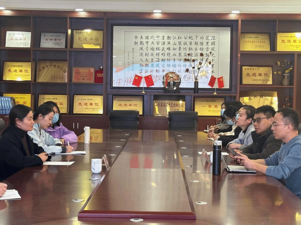 参观之后,双方来到会议室展开了热烈交流。首先,孙志敏园长对崮云湖中心幼儿园的办园理念、课程实施和设计等情况进行了介绍。随后,教工第一党支部党员张献华老师对崮云湖中心幼儿园环境创设提供了若干建议。针对崮云湖中心幼儿园教师代表提出的幼儿园教学小学化、特殊幼儿培养和教研问题,教工第一党支部党员教师王姝琼、王慧、李会玲、洪帅和郭伟等分别提出了自己的看法。会议最后,李中良做了总结发言。一是,幼儿园教师要学会利用中国知网等科研平台查找相关文献,并利用文献上的理论知识指导自己的教学实践。二是,幼儿园也要创立自己的教研组织,并围绕一线保育实践中的实际问题开展定期交流,做到从问题中来、到问题中,用教研支撑实践,用实践反哺教研。