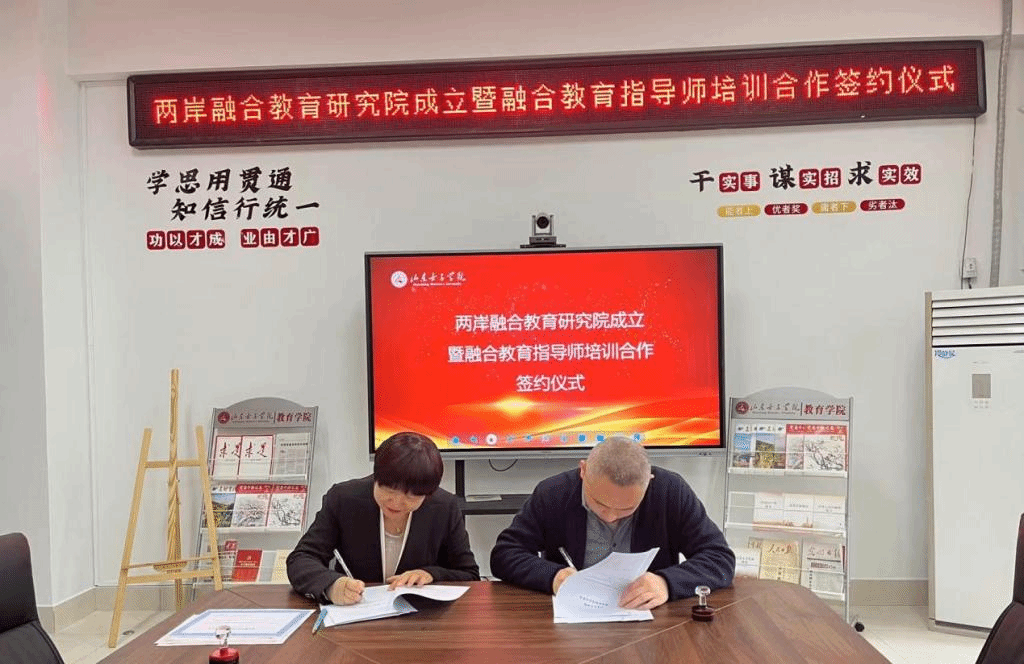 4月15日,教育学院举办两岸融合教育研究院成立暨融合教育指导师培训合作签约仪式。教育学院副院长(主持工作)王飞、潍坊两岸医教教育信息服务有限公司总经理刘联峰等参加仪式。
