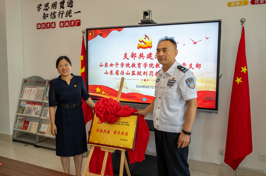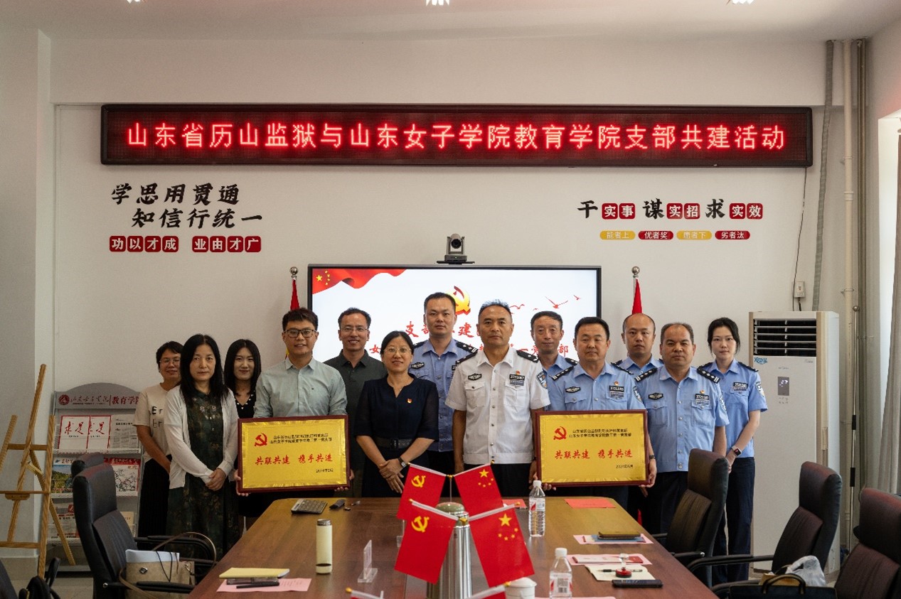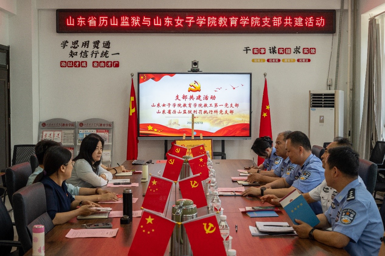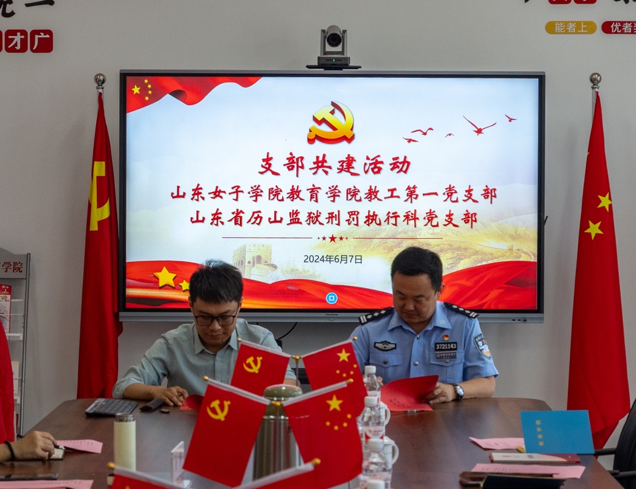 为深入贯彻落实党的二十大精神,全面贯彻习近平新时代中国特色社会主义思想,进一步创新基层党建工作载体,加强基层党组织建设,推进党纪学习教育走深走实,2024年6月7日,山东女子学院教育学院教工第一党支部与山东省历山监狱刑罚执行科党支部开展支部共建活动。历山监狱总会计师孟涛,刑法执行科党支部书记、科长曹金虎,党支部副书记、副科长贾辉及监狱干警同志,教育学院党委书记崔江宁、教授徐伟等部分党员代表出席会议,教工第一党支部书记李中良主持会议。