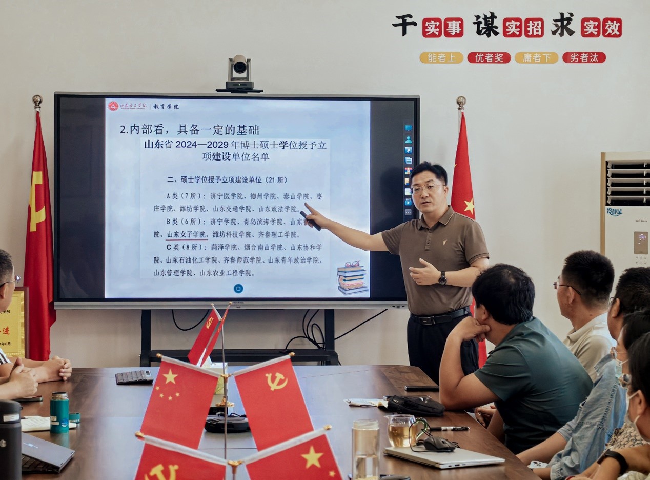 随后,学院副院长(主持工作)王飞以“众志成城,攻坚克难”为主题,结合学校的总体任务要求,详细梳理了学院新学期的工作安排。他首先传达了学校处级干部读书班和专家报告的主要内容,并分享了自己的学习心得和体会。王飞副院长深入分析了教育学院当前面临的形势和任务,特别是教育硕士专业学位点的困难。他指出,博士人才招聘、科研经费管理、专业认证、硕士点申报的短板解决、“四个一”工程、2025年高层次项目申报及横向课题的推进等,将是学院未来工作的重中之重。他还强调了在工作中需要处理好民主与集中的关系,及时履行职责,确保各项任务顺利完成。