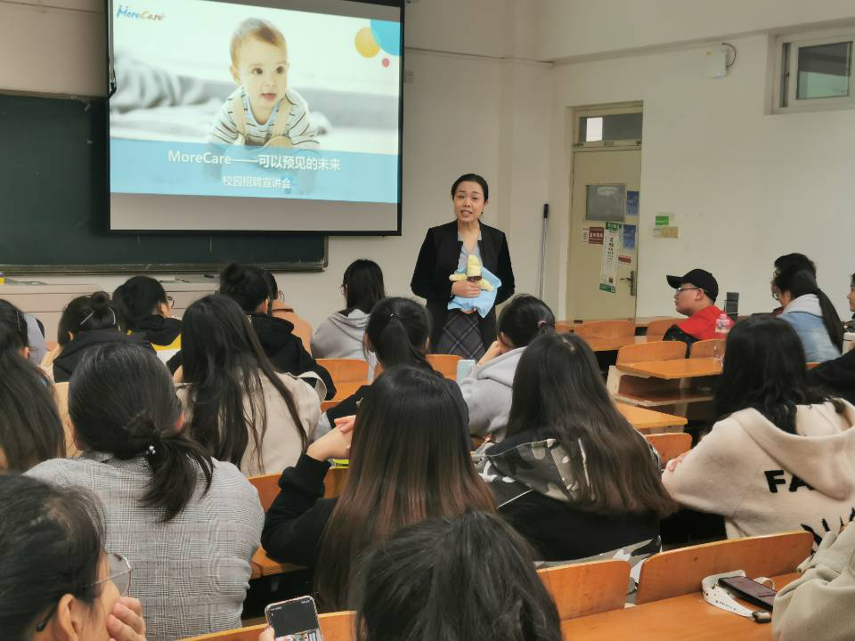 宣讲会开始,主讲老师们向同学们介绍了MoreCare的教学理念——养教合一的通识教育,在宝宝的日常生活照料过程中加入教育的元素,基于宝宝的兴趣,融合英文、科学、绘本、体能、艺术、音乐、文化、社交等游戏化的通识课程。老师们也为同学们展示学校坏境、教师准则、职业素养培训、外送培训等,也给年轻的同学们更多的发展环境与挑战自我的机会。随后,人力资源部以ppt的形式就MoreCare的一些规章制度,福利待遇,企业文化,现有产业分布、人文关怀等做了详细介绍,并现场解答了同学们的疑问。至此,宣讲会圆满结束。