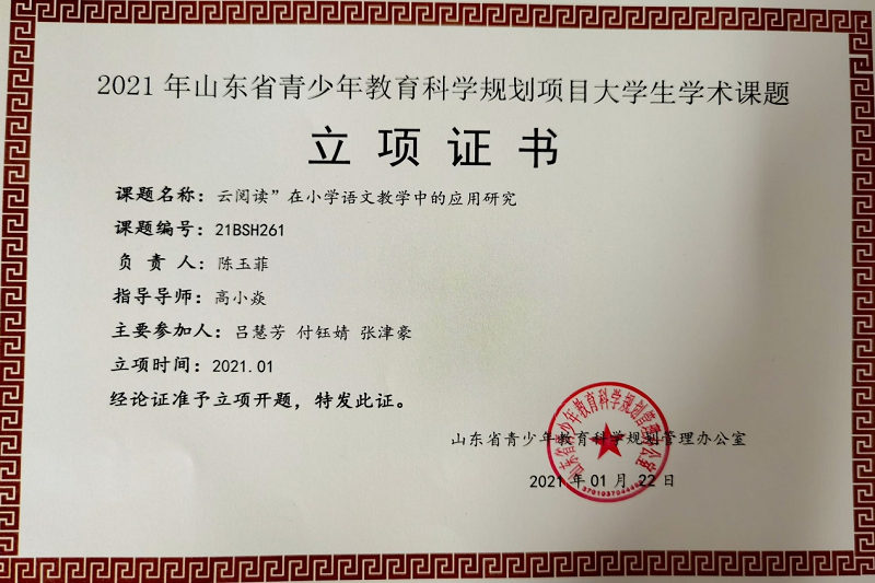 学生获批山东省青少年教育科学规划项目大学生学术课题