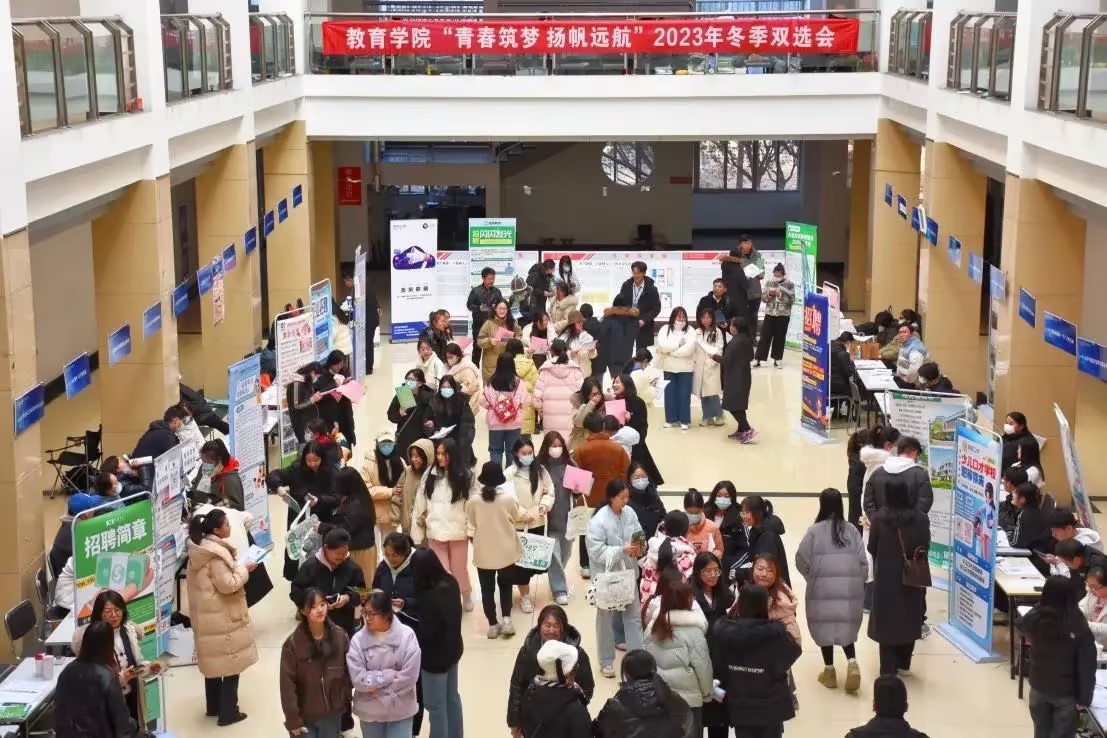 为贯彻落实党的二十大报告关于“实施就业优先战略”要求,搭建用人单位和毕业生双向选择的平台,11月23日下午,教育学院在博文楼大厅举办“青春逐梦·扬帆远航”冬季双选会,山东银座-英才幼儿园、济南槐荫区第三实验幼儿园、大圣光华教育科技(山东)有限公司等近40家单位参会,提供招聘岗位700余个,教育学院1000余名学生参加。