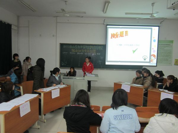 为了应对日趋严峻的就业形势,加强大一新生的就业观念,教育学院积极响应2011年山东女子学院大学生就业知识竞赛的号召,于2011年11月23日在普教楼402举行了大学生就业知识竞赛选拔赛。 此次共有教育学院五支代表队参赛。在同学们的热烈掌声中,她们分别作了慷慨激昂的赛前陈述,分别是为共同目标而努力的学前本科代表队、集信心毅力为一体的学前专科代表队、团结进取齐心协力的儿童英语代表队、唱响青春活力的音乐教育代表队以及舞动生命勇往直前的舞蹈教育代表队。比赛共设置选择题、风险题和抢答题三个环节。各队积极答题,你追我赶,在举手抢答环节更是难分伯仲。现场观众不时加油助威,气氛十分热烈。历经一个多小时紧张激烈的角逐,学前教育本科代表队获得冠军,活动圆满结束。 本次活动不仅体现了我院同学们参加学校活动的积极性,也使同学们增长了知识,提高了对未来职业规划的认识。希望大家能以此为契机,认真学习专业知识和技能,做好职前准备,为提高就业竞争力打下坚实基。我们期待着她们更加精彩的表现。