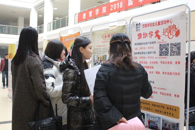 2017年12月30日,我院在博文楼大厅举办2018届毕业生双选会。此次活动由山东女子学院招生就业处与教育学院联合举办,山东女子学院附属幼儿园、山东省妇女儿童活动中心等130多家单位为我院提供了1500多个就业岗位,吸引了近500名毕业生前来参加。教育学院院长董吉贺、办公室主任李高波、辅导员陈鹏飞等到现场了解招聘情况,并与用人单位及毕业生亲切交谈。
