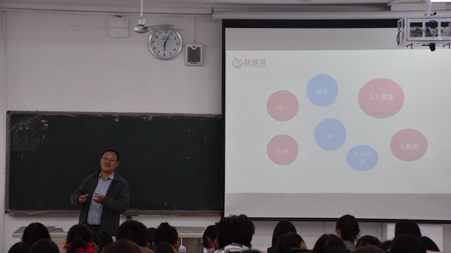下午六点,讲座正式开始。李经理依托其16年来的创业经验,从多个方面简述互联网高速发展所带来的改变。例如,在职业方面,网红、微商、软件开发师等新兴职业随着互联网的兴起与发展而产生,在经济方面,互联网经济、电子商务迅速发展等。除此之外,他还向同学们详细介绍了互联网发展的三阶段。李经理在讲话中表示:“上大学的目的是为了学习知识与培养思维,大学生应该独立思考、培养思维逻辑,用互联网思维来就业、创业。”他举出柯达胶卷的退市、传统出租车的更新换代和360的兴起与发展等例子来说明顺势的重要性,指出与时俱进是创业成功的重要因素。鼓励同学们坚持梦想,用宽广的胸怀去创造美好人生。至此,讲座正式结束。