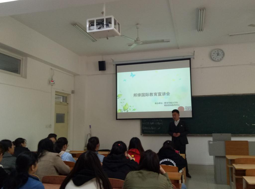 2019年4月11日15:00,教育学院于博学楼108召开邦倬国际教育集团宣讲会。邦倬国际教育集团的李老师与王老师及各级学生代表参与了此次宣讲会。