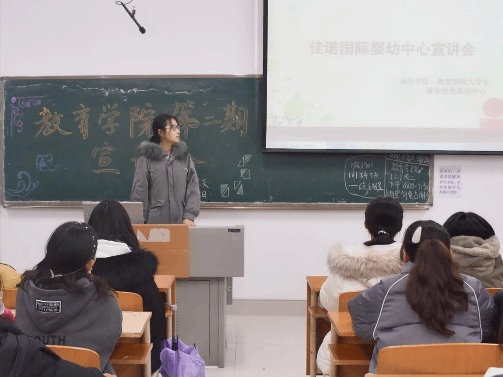 为提升学生对早教行业人才需求的认知、实现早期教育专业学生优质就业,教育学院于2020年10月8日在博文楼210举办了早教专业专场宣讲会,参加此次就业宣讲会的早教机构为佳诺国际婴幼中心。教育学院17级早教专业毕业生及部分学前教育专业学生参加了此次宣讲会。