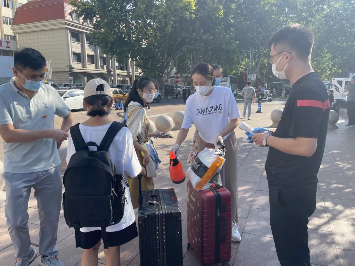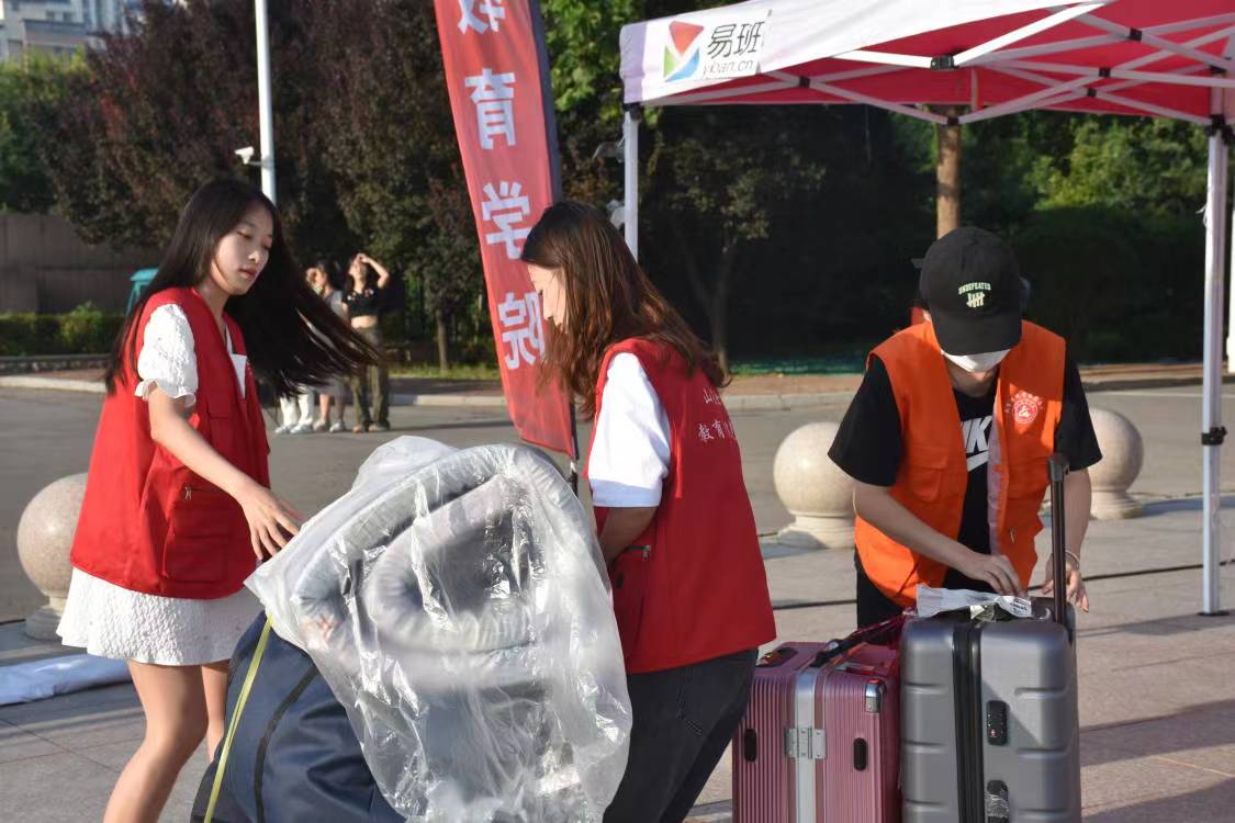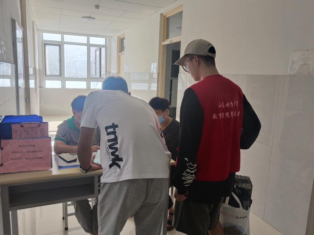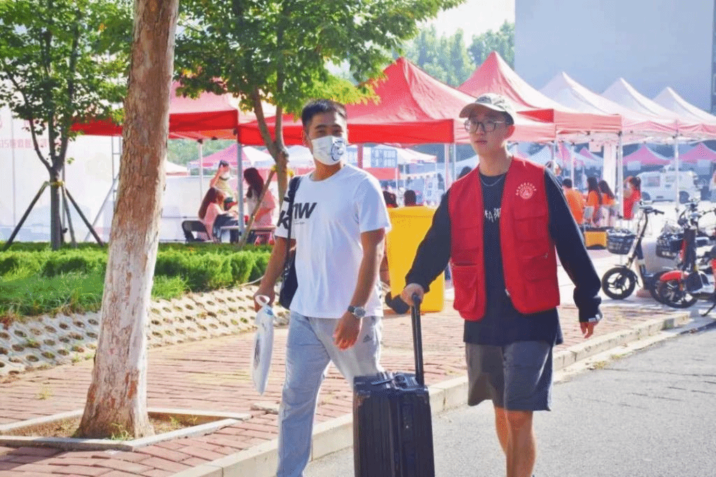 迎新当天,炎热的天气丝毫没有消减党员志愿者们的服务热情。秉承“创先争优树旗帜,服务奉献做表率”的宗旨,党员们积极发挥示范作用,身体力行、服务师生。在各志愿服务点,3名教师党员早早到达济南站迎接来自全国各地的同学,为他们指引去学校的路线,解决急需问题。校门口处,每个时间段均有4名学生党员有秩序的引导新生入校做好核酸检测工作。南门门口旁设立的迎新服务点位,每个时间段都有2名学生党员热情积极地为到校新生答疑解惑,主动耐心指引道路,并为新生提供矿泉水、消毒液等物品,协助老师班助发放“萌新七件礼包”,提供1V1定制化服务。迎新现场、新生公寓处、综合训练馆每个时间段共有30余名志愿者指路领路、搬运行李。尽管一天的工作使得党员志愿者们大汗淋漓,但在新生们初来大学时喜悦的渲染下,志愿者们也未觉疲乏,反而有了更加赤诚的助人之心。