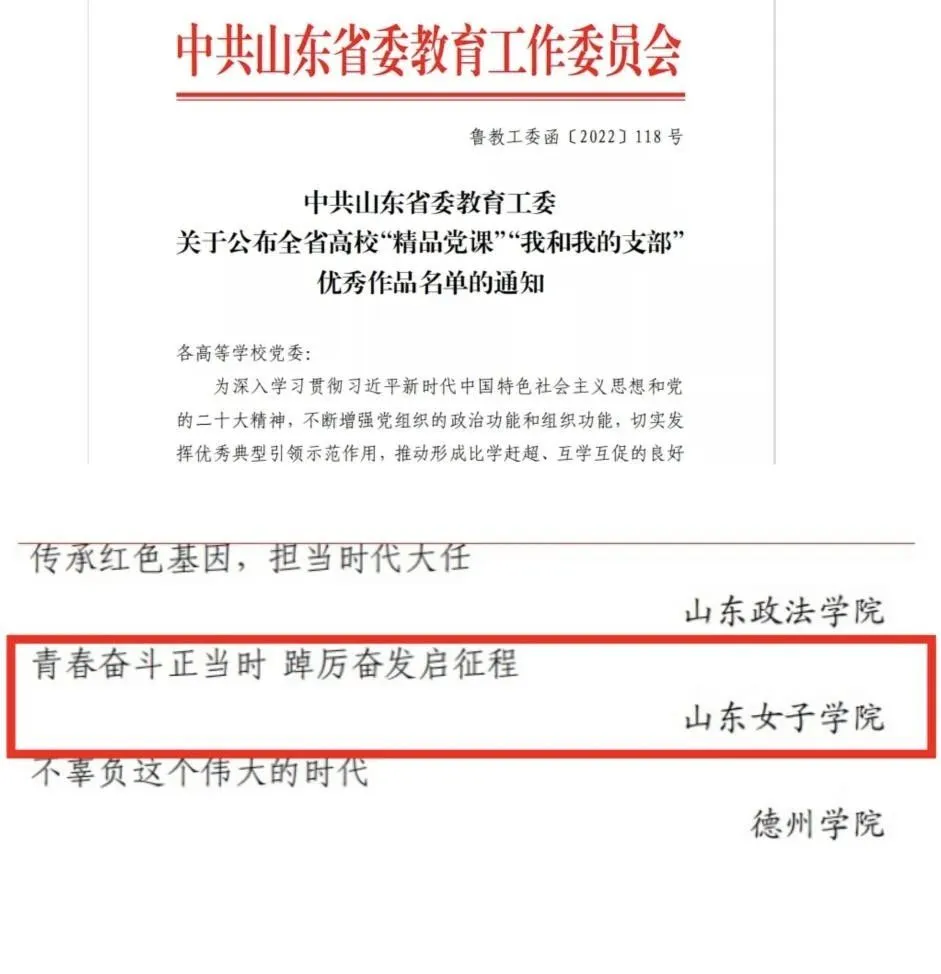 日前,山东省委教育工委公布全省高校“精品党课”“我和我的支部”优秀作品名单。由教育学院选送的题为“青春奋斗正当时 踔厉奋发启征程”党课荣获“精品党课”三等奖,主讲教师为学院学生第三党支部书记宫靖荃。