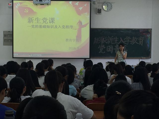 为了让2016级新生更好地了解中国共产党的基本知识、掌握入党要求和入党程序,帮助新生树立正确的指导思想,端正入党动机,鼓励2016级新生积极向党组织靠拢,8月31日上午,教育学院学生党支部书记王春晓在博文楼308和310教室为新生上了党课。