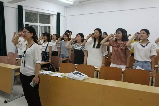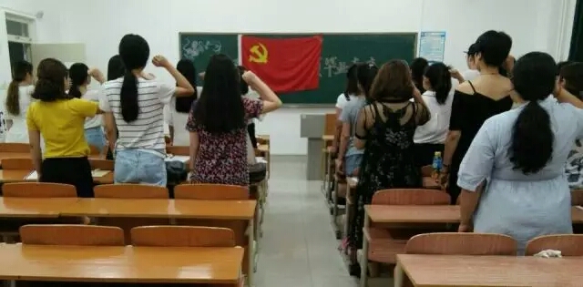 与此同时,田书记对参见本次会议的党员及预备党员提出了几点要求。第一,要增强角色意识和党员意识。时刻牢记党员身份;第二,要旗帜鲜明讲政治,增强政治意识,大局意识,核心意识,看齐意识。要着重强化政治意识观念;第三,党员要走前列,做表率,发挥好四个带头作用。工作中、学习中努力提高自我,加强个人品质修养,做到德才兼备,服务群众,遵纪守法,发挥好政治表率作用。最后田书记殷切希望在座各位毕业生继续前行,为自己的理想目标奋斗。会议最后,王春晓老师同在座各位党员、预备党员一起重新回顾党章党规,希望各位毕业生牢记党的各项规章制度,珍惜感恩党对于我们的培育。随后,王春晓老师带领全体人员重温入党誓词,鲜红的党旗前,庄重而真挚的誓言声缓缓响起,“我志愿加入中国共产党.....”