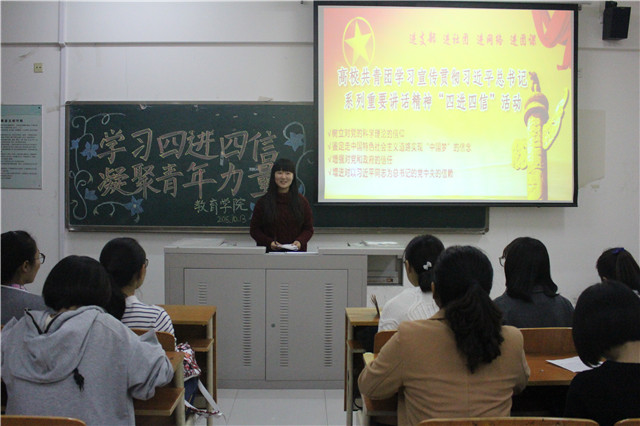 2015年10月13日,山东女子学院教育学院于1号教学楼304室召开了“学习四进四信,凝聚青年力量”主题座谈会,总结学院学习“四进四信”系列活动自启动以来的开展情况,为我院学习“四进四信”系列活动画上圆满句号。15级各班学生代表出席此次会议。 会议伊始,主持人向大家讲明了本次活动的目的,并带领大家共同学习了“四进四信”的主要内容,阐述了进支部、进社团、进网络、进团课的深刻含义,号召大家牢固树立对党的科学理论的信仰,积极传播青春正能量,并要求各班代表在立足于自身学习和工作的基础上进一步坚实实现“中国梦”的信念,增强对党和政府的信任,增进对以习近平同志为总书记的党中央的信赖,做好讲话精神的积极传播者和坚定实践者。针对主持人讲话内容,各班代表表达了对“四进四信”内容的理解与感悟,并就前期开展的主题班会、小组讨论、观看视频、知识竞赛等一系列班级活动情况作简要汇报,展示班级学习“四近四信”重要精神的成果,引导更多的同学树立正确的人生价值观,更加坚定爱党爱国的成长理念。 活动的开展表明了各班深入学习“四进四信”精神的决心,展示了我院学子的良好风貌,同时进一步明确了当代大学生的思想方向与自身责任,有利于同学们在新的时代背景下积极投身于社会主义建设,为祖国美好未来而奋斗。