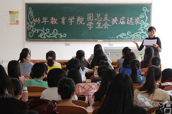 继往开来,续谱新篇。9月25日,教育学院2014届团总支学生会换届工作于2号楼拉开帷幕。本次换届大会由教育学院团总支书记路敏、王春晓、12级团总支学生会老干部以及13级有竞选意愿的全体成员出席会议。 下午13:30分,会议准时开始。整场会议以“公平、公正、公开”为原则,在严肃认真的氛围下有序展开。此次竞选的方式为民主评议,首先由经过了组织报名、资格审查之后的参选人员上台演讲,继而由两位老师以及主席团的各位主席、往届部长根据参选人员的现场表现及平时工作表现予以现场投票。演讲台上,每一位参选人员都沉着冷静、自信满满,他们用流利的话语把自己的竞选优势和竞选动力娓娓道来,从容地向各位评委老师展现出工作中、生活中最真实的自己。无论是对自己部门的认知,还是对于整个学生会的看法,每一位参选人员都有自己独到的见解。整个竞选过程中,各位参选人员表现精彩,赢得现场老师以及主席团成员、各部部长的一致好评。前来竞选的干事们,都向我们展现出了一个“和谐、健康、积极、文明”的学生会集体。 本次集中面试持续近3个小时,参加竞选的60名同学分别表达了加入团委、学生会的愿望和为学校同学服务的决心,展示了我校莘莘学子朝气蓬勃的精神面貌。后路敏老师总结了这次换届大会,她表达了对教育学生会的热切期望和美好祝愿。同时,她还对往届部长表达感谢,感谢各成员曾对教育学院发展付出的努力。 至此,学生会换届工作圆满结束,此次换届大会的成功举办,不仅为团委、学生会注入了新鲜血液,也对今后团委各项工作的顺利进行奠定良好基础。