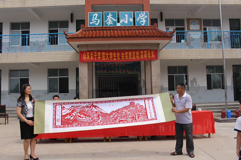 万德镇党委书记、山东女子学院副院长分别讲话,他们指出社会实践基地是高校、地方、大学生“三方共赢”的有效载体,能使大学生在实践活动中接受锻炼、奉献力量、增长才干,贺兴利副院长希望大学生们在实践中虚心学习,切实提高实践能力,结合专业特色,为老百姓做一点实事,随后双方共同为实践基地揭牌。教育学院党总支书记田莉春为马套村敬赠“中国万里长城”剪纸作品,学院领导老师为马套小学赠送物品,志愿者代表就如何开展好此次社会实践活动做了表态发言,并与留守儿童结对交换了“爱心卡”。