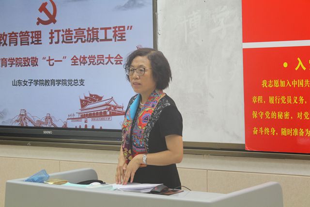 会上,首先由教育学院院长、党总支副书记董吉贺带领全体党员学习《中国共产党党员教育管理工作条例》内容。随后,崔江宁详细解读了教育学院党总支书记抓基层党建突破项目方案--《亮党员旗帜、做时代先锋》。接着,教育学院教工第一党支部、第二党支部和学生党支部书记分别向大会汇报各支部围绕学生学业生涯与指导、教师发展和学生服务领域的“亮旗工程”具体举措及进展情况。在榜样领航环节,科研秘书、博士程伟老师,山东省优秀辅导员获得者李绍妮老师分别结合本职岗位做事迹汇报。会议最后环节,教育学院党总支书记李君结合本次会议主题,围绕如何加强党员教育管理、打造亮旗工程为全体党员上了党课。