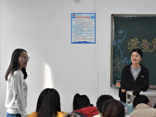 2019年10月12日上午十点,山东女子学院于博学楼421教室进行了学生党员联系新生班级的活动,教育学院学生党员王静、焦楠与入党积极分子代表参加了本次活动。