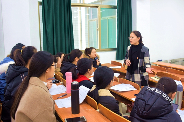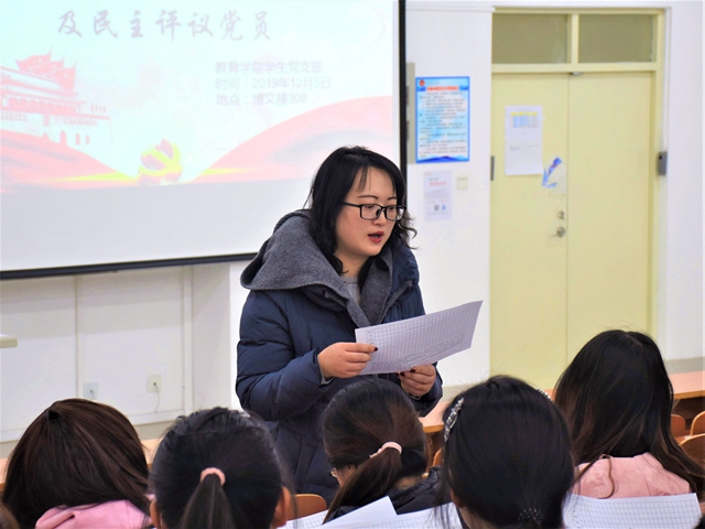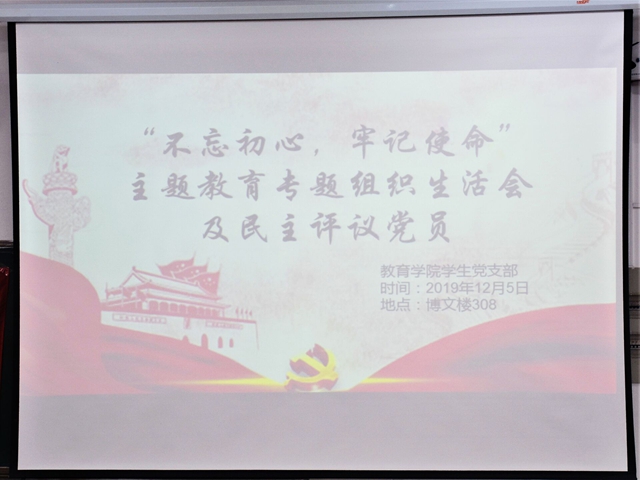 2019年12月5日,山东女子学院教育学院学生党支部在博文楼308教室召开“不忘初心、牢记使命”专题组织生活会及民主评议党员活动。此次活动由教育学院学生党支部书记王春晓主持,支部组织委员李绍妮老师、宣传委员路敏老师及支部师生党员到场参加。