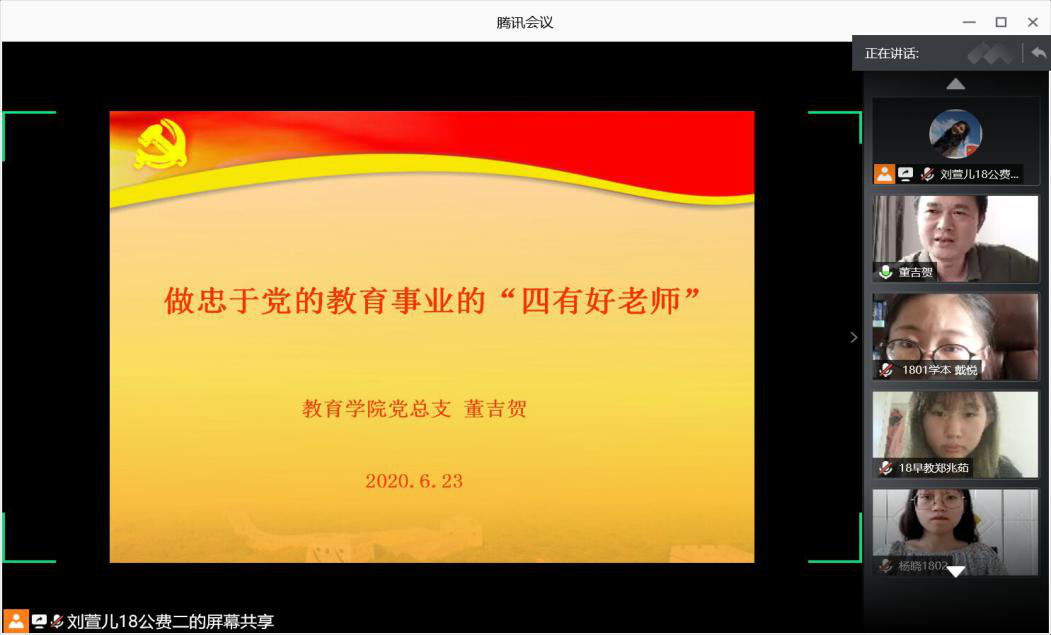 为深入学习贯彻习近平新时代中国特色社会主义思想,引导学生树立正确的世界观、人生观、价值观,6月23日下午,教育学院院长董吉贺给学院五十余名同学带来了一场别开生面的思想政治课。课程主题为:做忠于党的教育事业的“四有好老师”。
