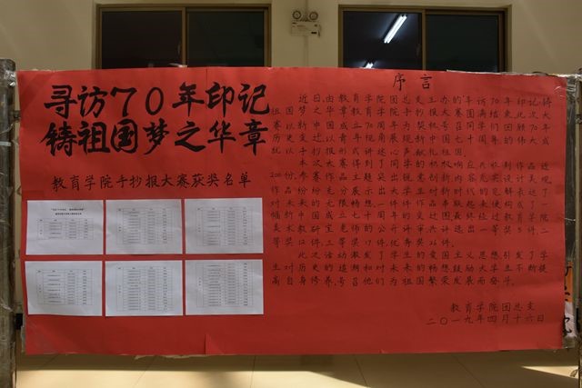 4月17日,教育学院于博文楼一楼大厅举行“寻访70年印记•铸祖国梦之华章”手抄报大赛获奖作品展。本次大赛由教育学院团总支主办,共收到作品近200份。最终经公开评审,共评选出一等奖5件,二等奖12件,三等奖17件,优秀奖26件。