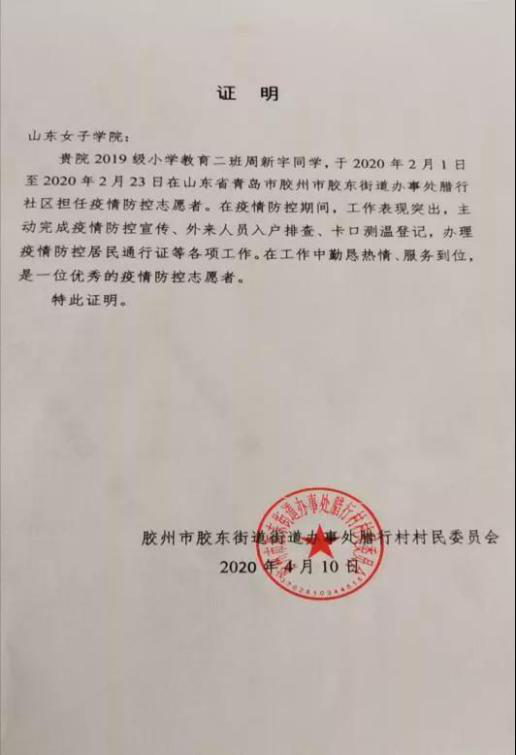 疫情来临,我毫不犹豫地参加了本村疫情防控小组地志愿工作,拉封锁线,宣传疫情防控知识,做思想工作,协助村长站岗上哨,负责进出村口人员登记并测量体温,严格控制人口出村的数量。疫情期间,不得有半点疏忽,刚开始有些村民不配合也不理解我们的工作,我们努力劝说并号召大家一起参加志愿活动。虽然天气很冷,有时还下着小雨,但心里是暖和的。我参加了两个多星期的志愿工作,十几天听起来很短,但我心里很畅快,期间受到的委屈也烟消云散,很开心能做出我的一份贡献。
