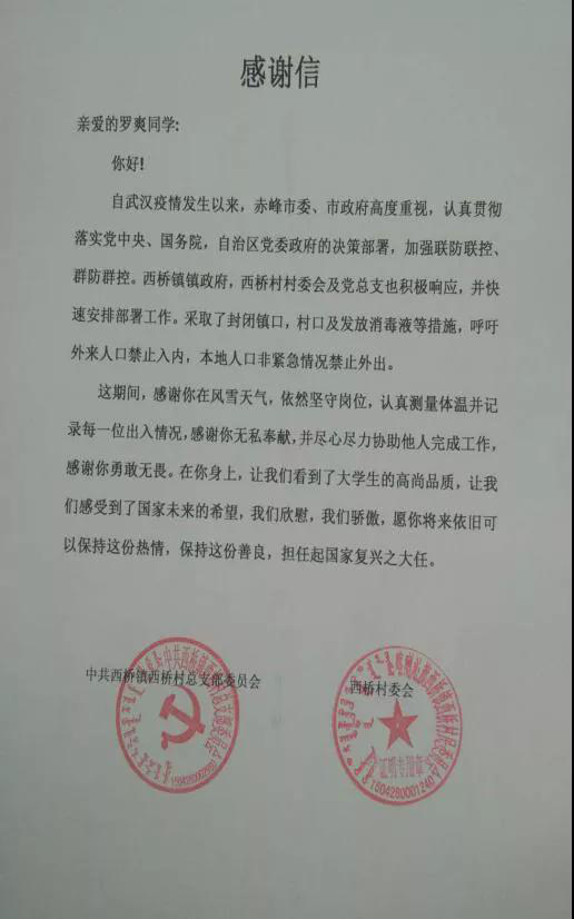 “疫情就是命令,防控就是责任。”在全国上下众志成城,抗击疫情期间,作为一名大学生,同时也是一名共青团员,我在做好自身防护的同时,也有义务为村庄、为国家做点贡献,从身边力所能及的事情做起,积极协助社区疫情防控工作。一个时代有一个时代的使命,一辈人有一辈人的责任与担当。新时代的青年应该在祖国和人民需要的时候挺身而出。守护我们的,从来都不是超人,而是十四亿同根的家人。