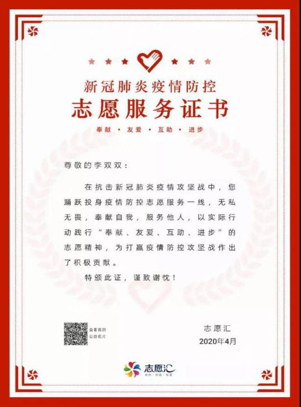 此次疫情志愿工作让我学到很多东西。我也更加明白了保护大自然,保护自然界生灵的重要性;我更加珍视生命,爱惜健康;我更加真切地体会到了“众志成城,同舟共济”和“大爱无疆”的深刻含义。疫情无情,人间有大爱,疫情期间每个人点点滴滴的小事,更让我的内心有着深深的感触。疫情还未结束,但请相信我们的国家!相信我们的医学!相信为疫情防控坚守在岗位上的工作人员!相信阴霾终将散去,春天即将来临!